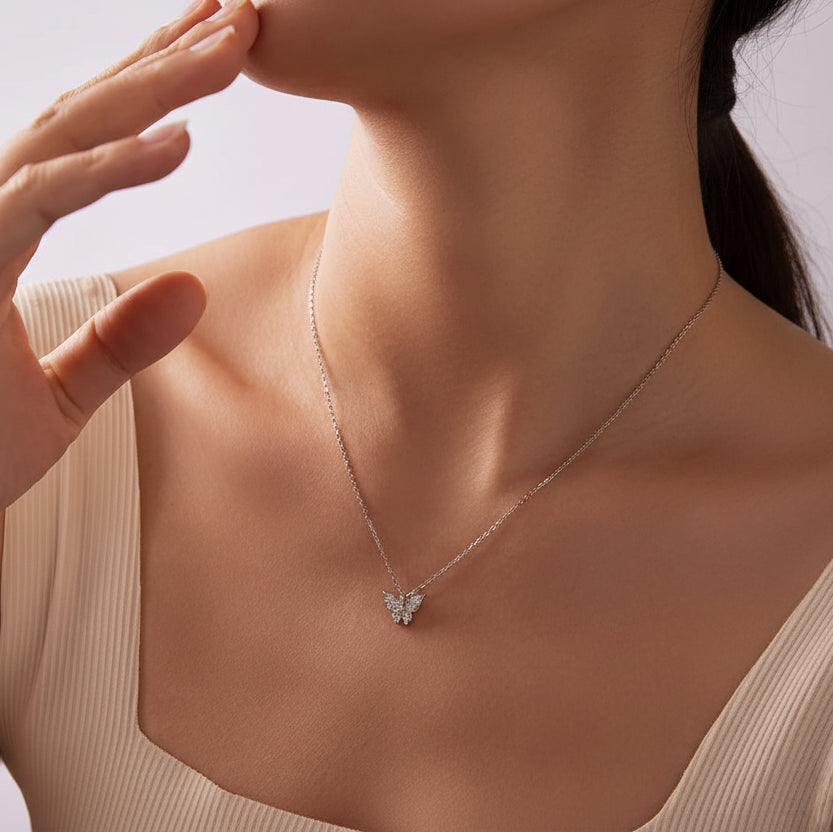 Add a graceful sparkle to your jewelry collection with this butterfly pendant necklace made with pure 925 sterling silver. Featuring a delicate butterfly design accented with brilliant moissanite stones, this necklace symbolizes beauty, transformation, and elegance. Its refined style makes it perfect for everyday wear or special occasions.